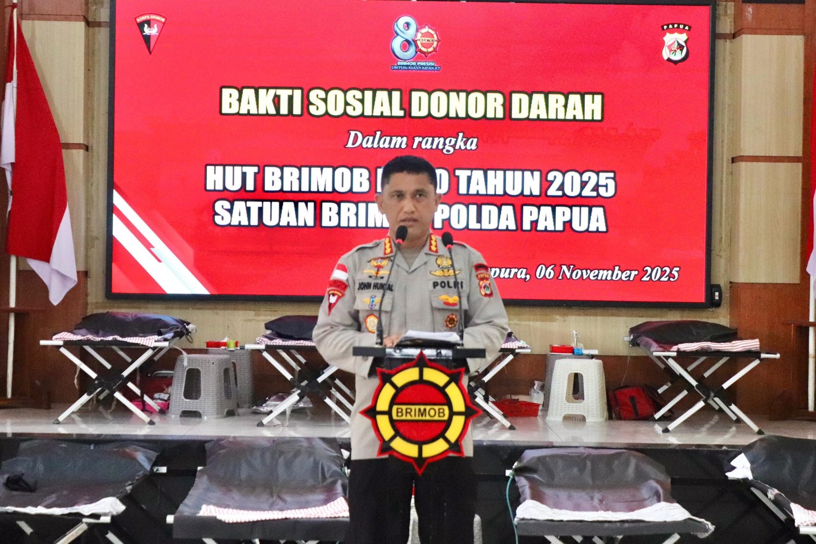 Papua – Dalam rangka memperingati Hari Ulang Tahun (HUT) ke-80 Korps Brimob Polri, Satuan Brimob (Satbrimob) Polda Papua menggelar kegiatan donor darah di Aula Koesjaeri Mako Brimob Polda Papua. Kegiatan sosial yang diikuti sekitar 150 peserta ini menjadi wujud nyata kepedulian Brimob terhadap sesama sekaligus bagian dari rangkaian perayaan HUT Brimob tahun 2025 yang mengusung tema “Brimob Presisi untuk Masyarakat.”