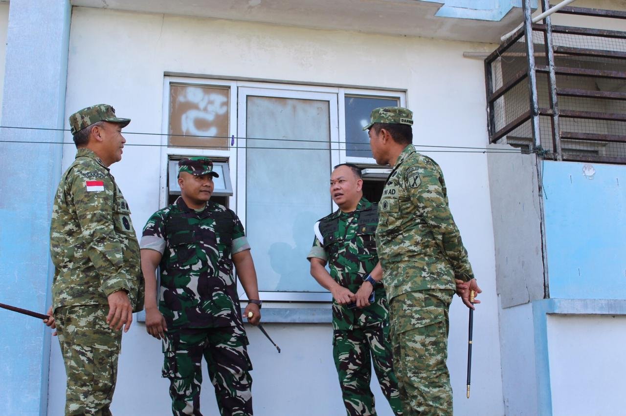 Bitung – Pangdam XIII/Merdeka, Mayjen TNI Mirza Agus, S.I.P., bersama Danrem 131/Stg Brigjen TNI Martin Susilo Martopo Turnip, S.H., M.H., melakukan peninjauan lokasi Marshalling Area (MA) tempat sementara penampungan prajurit Batalyon Teritorial Pembangunan (YTP) 916/Makawidey.