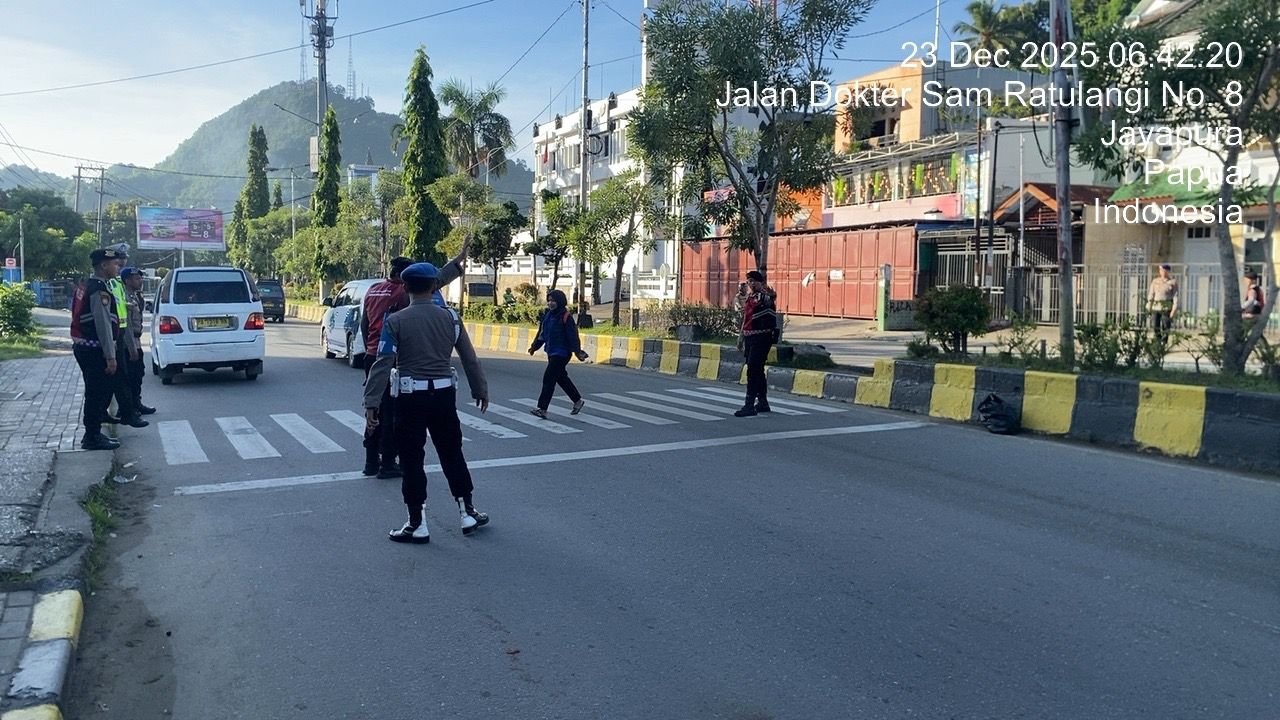 Papua – Dalam rangka mendukung kelancaran arus lalu lintas serta menciptakan situasi keamanan, keselamatan, ketertiban, dan kelancaran lalu lintas yang kondusif selama perayaan Natal dan Tahun Baru, personel Operasi Lilin Cartenz 2025 Polda Papua melaksanakan kegiatan strong point di sejumlah titik strategis dan rawan kepadatan di wilayah Kota Jayapura, Selasa (23/12/25).