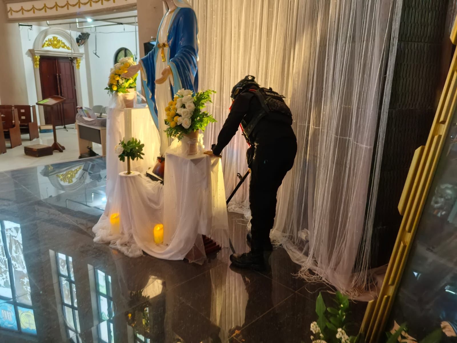 Manokwari – Menjelang pelaksanaan ibadah Natal, personel Satuan Brimob Polda Papua Barat yang tergabung dalam Operasi Lilin Mansinam 2025 melaksanakan kegiatan sterilisasi di sejumlah gereja prioritas guna memastikan situasi aman dan kondusif Rabu(24/12/25).