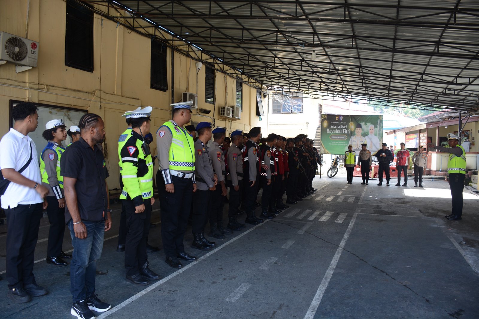 Apel dipimpin oleh Kasatgas Kamseltibcarlantas, AKBP Marthin W. Asmuruf, S.Sos., M.M, dan diikuti oleh personel yang terlibat dalam operasi.