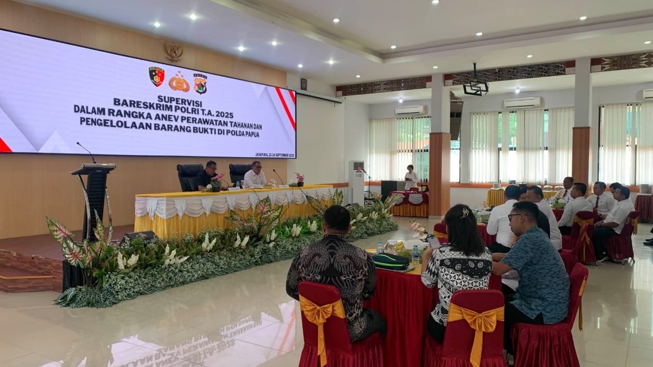 Papua – Kepolisian Daerah Papua menerima supervisi dari Tim Bareskrim Polri Tahun Anggaran 2025 dalam rangka Analisa dan Evaluasi (Anev) Perawatan Tahanan dan Pengelolaan Barang Bukti. Kegiatan tersebut berlangsung di Aula Rastra Samara Mapolda Papua, Rabu (24/09).