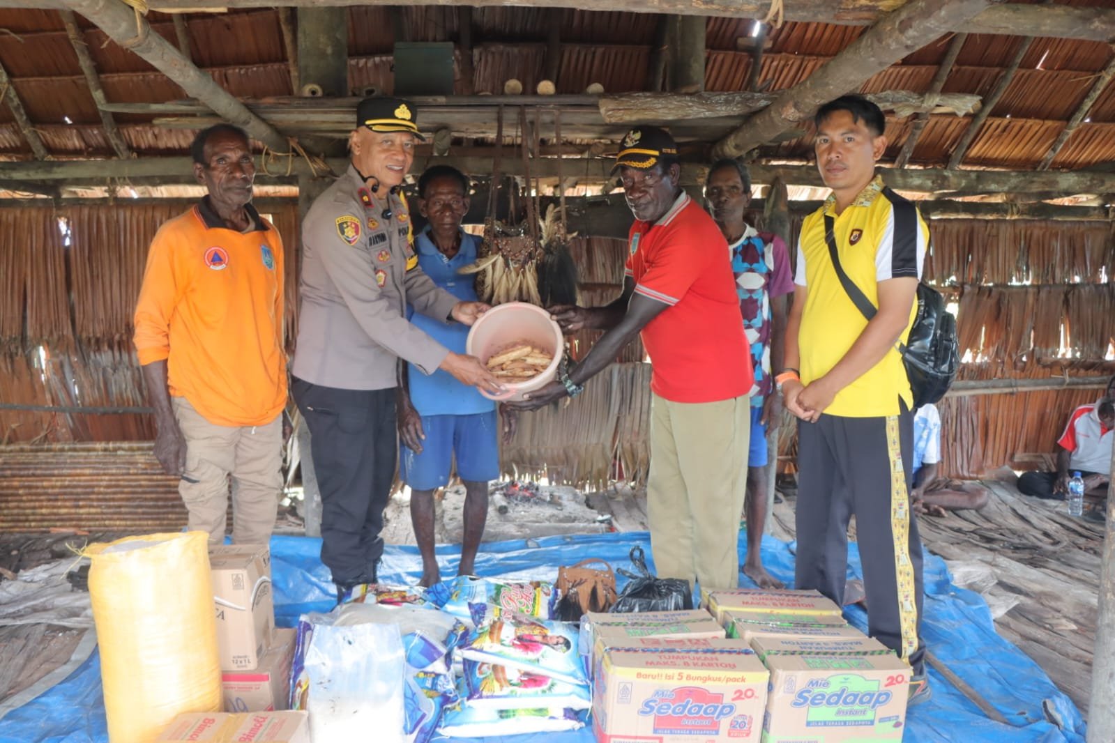Pada kesempatan tersebut, Polres Asmat menyerahkan bantuan sembako kepada masyarakat Kampung Mbait, antara lain, 5 karton Indomie,15 karung beras,1 karung sagu,1 baskom ulat sagu,20 bungkus gula pasir,15 botol minyak goreng,2 slop rokok Lampion,5 pak kopi Senang,5 pak teh Sariwangi, 2,5 kg pinang, ½ kg kapur