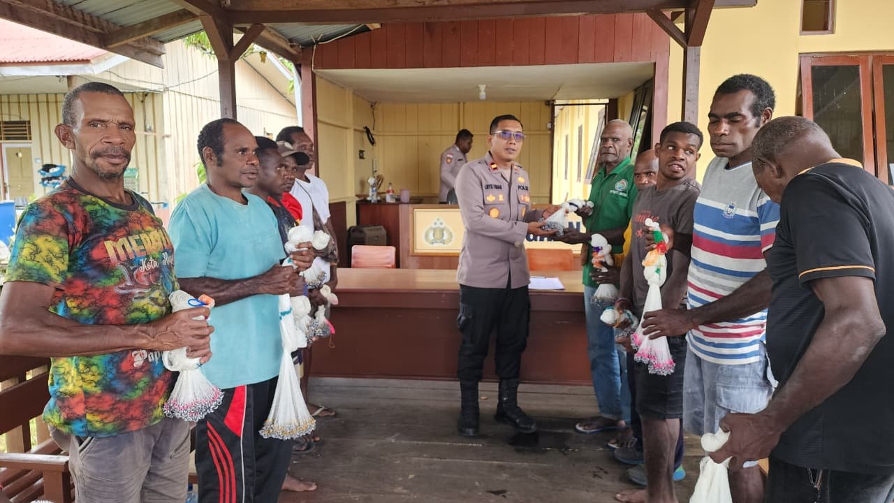 Papua – Kapolres Asmat AKBP Wahyu Basuki, S.I.K., melalui Kapolsek Atsj I Nyoman Tunas, berikan bantuan Jala Udang kepada kelompok nelayan di 4 Kampung diantaranya Kampung Atsj, Kampung Yasiuw, Kampung Bakasei dan Kampung Waganu, Bertempat Di Mako Polsek Atsj, Sabtu (01/11/2025).
