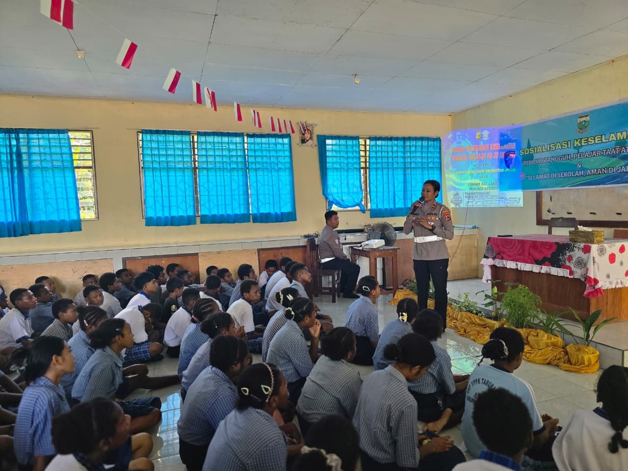 Papua – Satuan Lalu Lintas Polres Keerom melaksanakan kegiatan sosialisasi keselamatan berlalu lintas di SMP YPPK Taruna Tegasa, Arso Kota, Kabupaten Keerom, Rabu (10/12/2025).