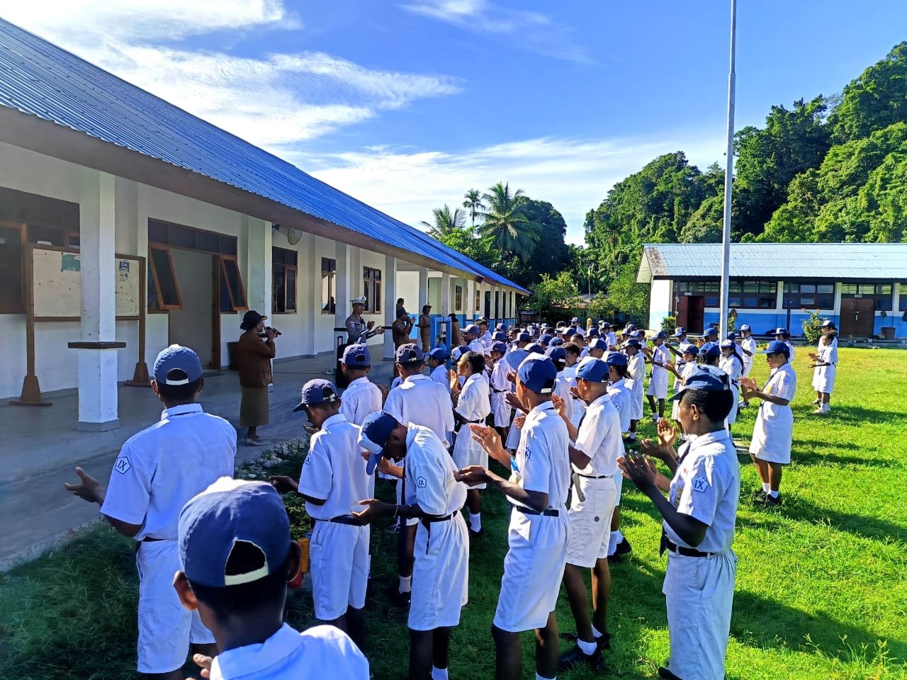 Kegiatan tersebut dipimpin oleh KBO Sat Lantas Polres Sarmi, Ipda Mulyadi, S.Sos, yang bertindak sebagai Inspektur Upacara (Irup) dalam pelaksanaan upacara bendera di sekolah tersebut.