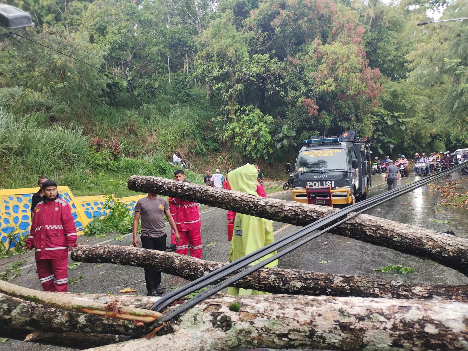 Tak berselang lama, personel Direktorat Sabhara Polda Papua tiba di lokasi dan langsung melakukan pembersihan material pohon tumbang bersama personel PJR Polda Papua dan masyarakat sekitar. Upaya gotong royong ini memastikan jalur utama di kawasan Skyland kembali aman dan lancar dilalui pengguna jalan.